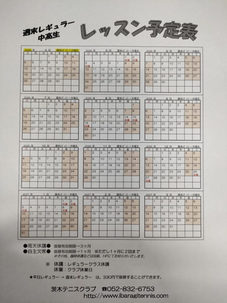 2026年度 ジュニアスクール週末クラス、中高生クラス予定表